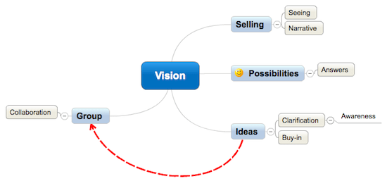 - Buy-in and collaboration. Your vision becomes a stake in the ground. You can use the mindmap for task management and accountability. The tactical parts of making the future real need to be added to the map in a logical and connected way.