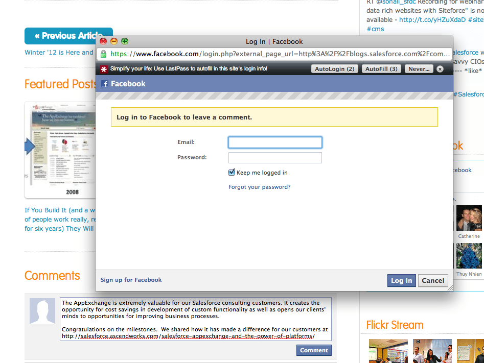 I was on Salesforce.com’s Blog doing some research for some articles I was writing. I wanted to leave a comment and refer back to another article I wrote on Salesforce.com’s platform and AppExchange. Then a weird thing happened. Social media wires got crossed. In their zeal Salesforce.com would only let me leave a comment by logging into my Facebook account and linking it to the comment plugin.